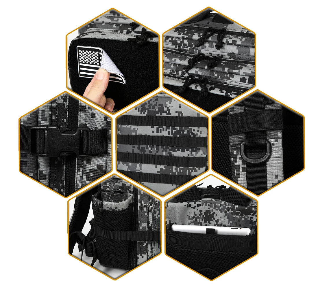 Designed for outdoor enthusiasts, the Outdoor Camouflage Backpack blends durability with practical design, perfect for rugged adventures. Crafted from high-quality polyester, this 45L softback backpack offers ample space for all your gear while ensuring resistance to wear and tear. Its camouflage pattern provides discreet style suited for hunting, hiking, or tactical use. Specifically tailored for men, it avoids any harmful chemicals, prioritizing safety and comfort. Although it does not include a rain cover, the robust polyester material offers reliable protection against mild weather conditions. An expert choice for those demanding durability and functionality in their outdoor equipment.